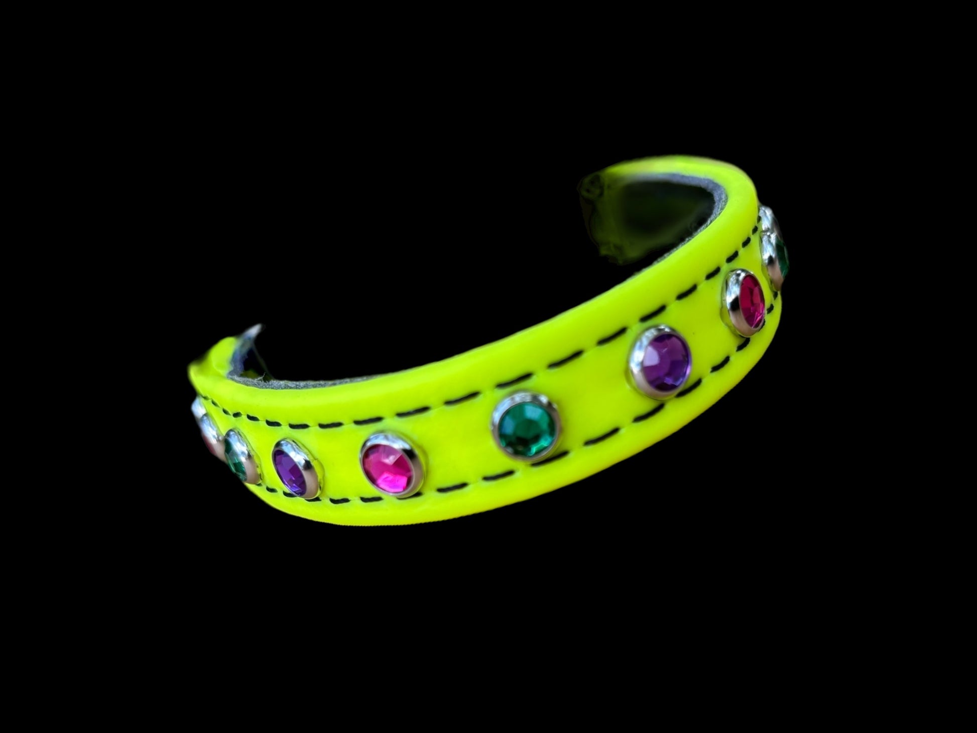 3/4" Collar: safety Yellow BioThane with alternating Green / Raspberry / Purple Jewels with a Black Leash
