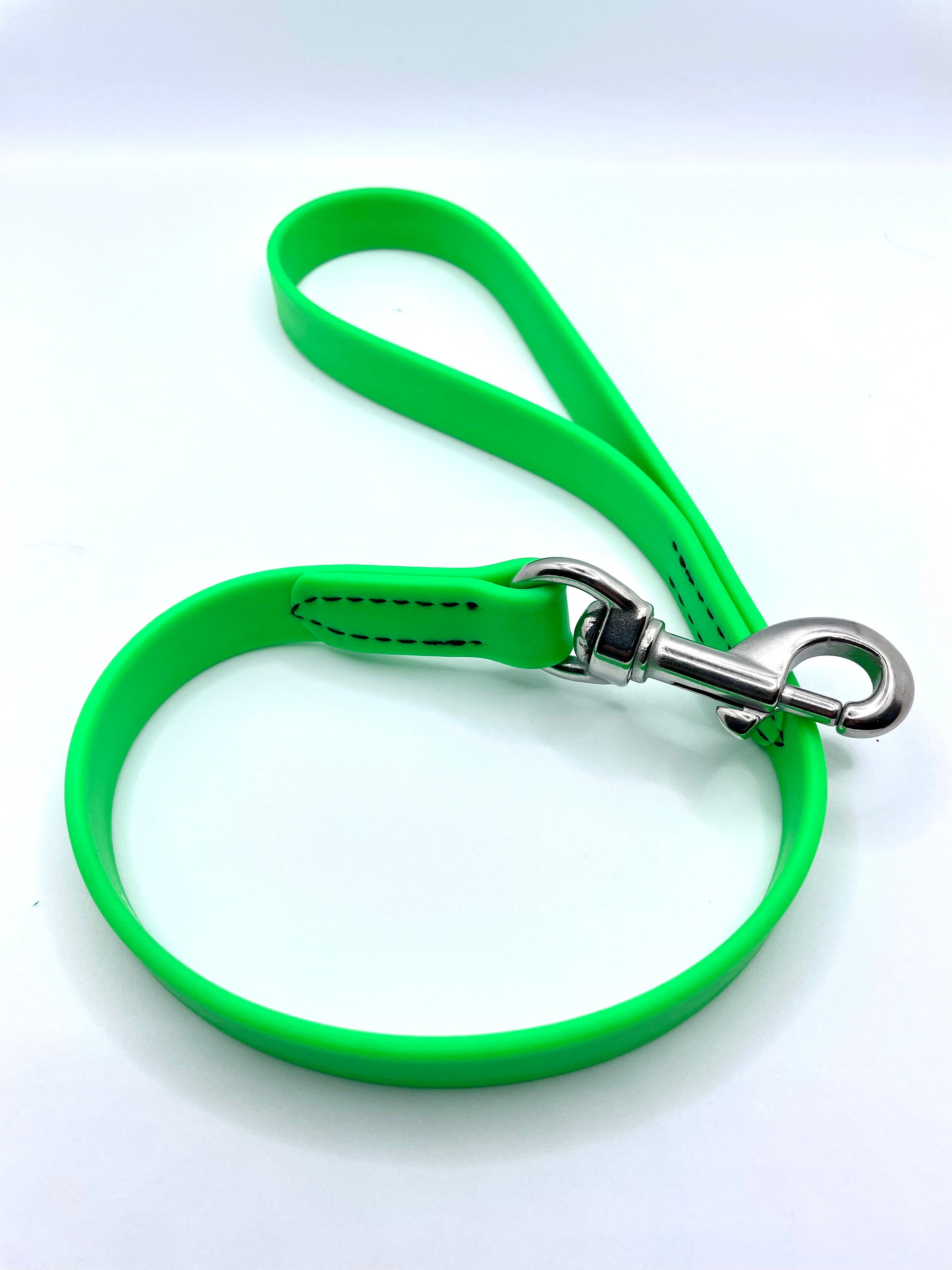 Everybody needs a snap lead! Ours are not your average snap lead they are waterproof, odor proof, and durable with a heavy duty stainless steel Snap. You can dump them in a mud puddle and have them perfectly clean immediately. After a little use they will soften to feel like leather in your hands. These snap leads are stitched for strength and durability.