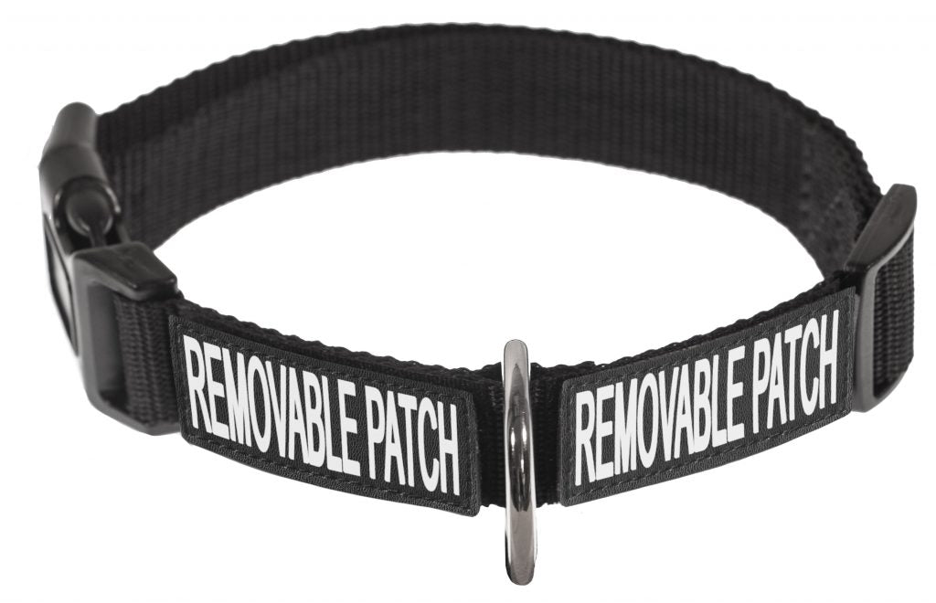 The Omega nylon collar made by Dogline has a hook and loop fastener to attach the same Reflective Removable Patches used on both the Quest and Unimax Harness.